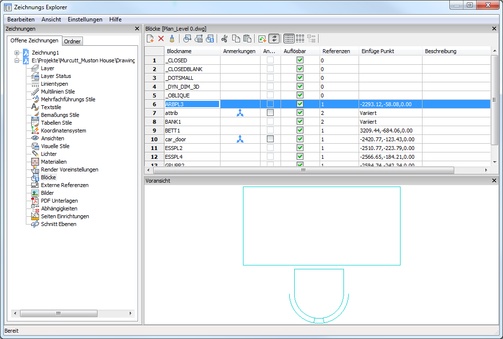 Zeigt das Dialogfenster Zeichnungs Explorer im Abschnitt Blöcke an: