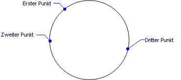 Bestimmt den Kreis über drei Punkte auf seinem Umfang; Sie werden zu folgendem aufgefordert: Erster Punkt auf Kreis - Geben Sie die Koordinaten ein oder wählen Sie einen Punkt. Zweiter Punkt - Geben Sie die Koordinaten ein oder wählen Sie einen weiteren Punkt. Dritter Punkt - Geben Sie die Koordinaten ein oder wählen Sie einen weiteren Punkt. Die Abkürzung für diese Option ist 3. |