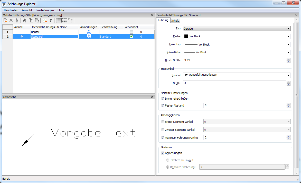 Menü: Werkzeuge | Zeichnungs Explorer | Mehrfachführungs Stile...