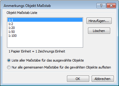 Hinzufügen oder entfernen von unterstützten Maßstäben für Anmerkungs Objekte über einen Dialog.