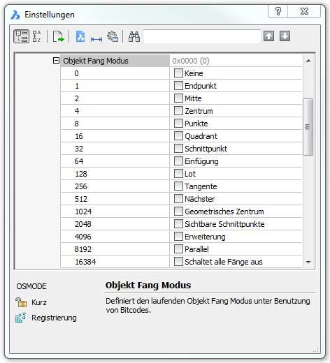 Schaltet den Objekt-Fang Modus über den Einstellungen Dialog (kurz für "Objekt Fang").