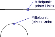 Schaltet den Objektfang Modus Mittelpunkt ein oder aus. Fängt sich an der Mitte von Linien und Bögen und anderen offenen Objekten.