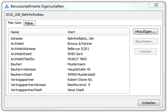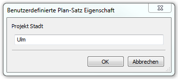Öffnet den Dialog Benutzerdefinierte Eigenschaften, mit dem Sie benutzerdefiniert Plansatz und Plan Eigenschaften hinzufügen können.