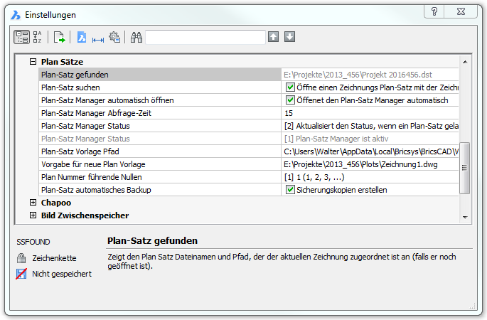 Plan-Satz suchen (SSLOCATE): Steuert. ob BricsCAD versucht einen Plan-Satz zu suchen und zu öffnen, wenn eine Zeichnung geöffnet wird.