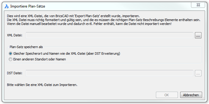 Plan-Satz speichern als: Wählen Sie, ob die importierten XML-Datei als DST-Datei am gleichen Speicherort und Namen der XML-Datei gespeichert werden soll, oder ob die Datei an einem anderen Standort oder Namen gespeichert werden soll. Wenn Sie die Option "Einen anderen Standort oder Namen" wählen, klicken Sie auf die Schaltfläche Durchsuchen ( ) auf der rechten Seite des Feldes DST Datei, um den Ordner und den Datei-Namen anzugeben.