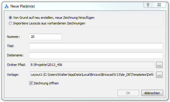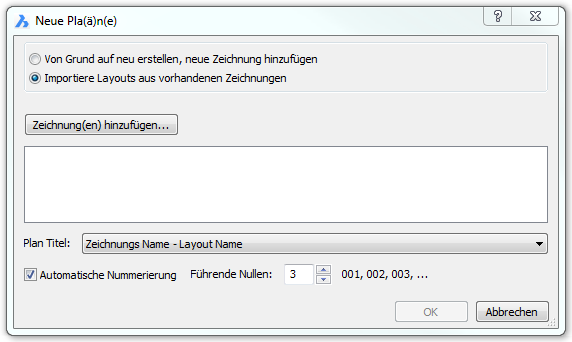 Die Option Importiere Layouts aus vorhandenen Zeichnungen erzeugt neue Plansätze. Der Dialog Neue Pla(ä)n(e) ändert sich: