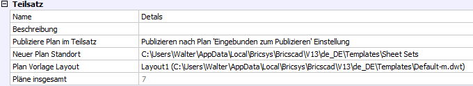 Plan-Satz Vorlage Pfad (SheetSetTemplatePath): Definiert den Pfad zum Plan-Satz Vorlagen Ordner. Klicken Sie auf die Schaltfläche Durchsuchen ( ), dann wählen Sie den Ordner im Dialog Verzeichnis wählen. Der Standardpfad ist: C:\Benutzer\Benutzer-Name \AppData\Local\Bricsys\BricsCAD\Vxx\de_DE\Templates\Sheet-Sets