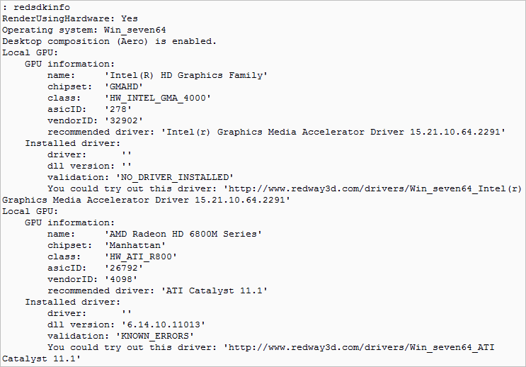 Zeigt renderspezifische Hardware und Treiber-Spezifikationen im Fenster BricsCAD Eingabe Protokoll.