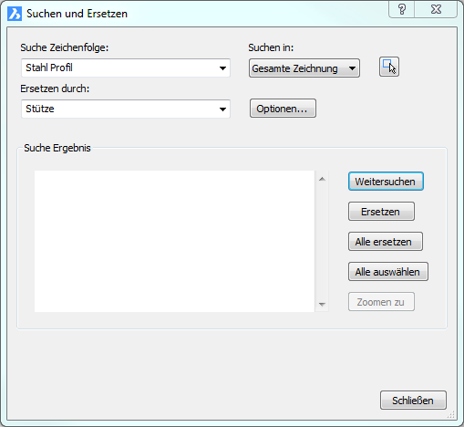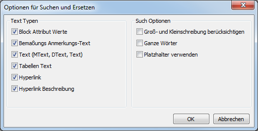 Sucht nach Text und ersetzt diesen optional; durchsucht Textblöcke, Attribute, Bemaßungen und Hyperlinks.