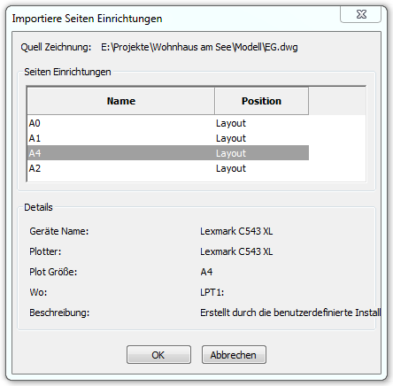 -SeinrichtImp - importiert die Seiten Einrichtungs Definitionen aus einer anderen Zeichnung über die Befehlszeile.