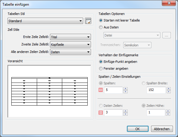 Erstellt ein Tabellen Objekt in der Zeichnung über eine Dialog Eingabe.