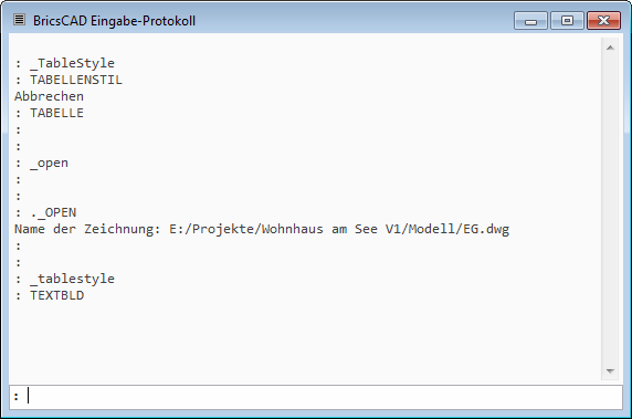 Zeigt das Fenster BricsCAD Eingabe-Protokoll an (kurz für "Text Bildschirm"); in diesem Fenster werden die letzten 256 Zeilen der Befehlszeile angezeigt (Befehle und Meldungen).