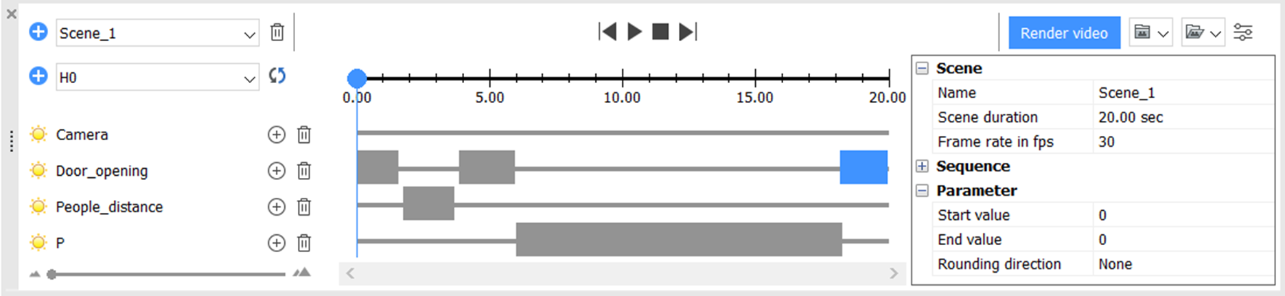 - Endzeit - Endzeit der Sequenz, in Sekunden. Bei Änderung wird die Laufzeit angepasst, die Startzeit bleibt unverändert