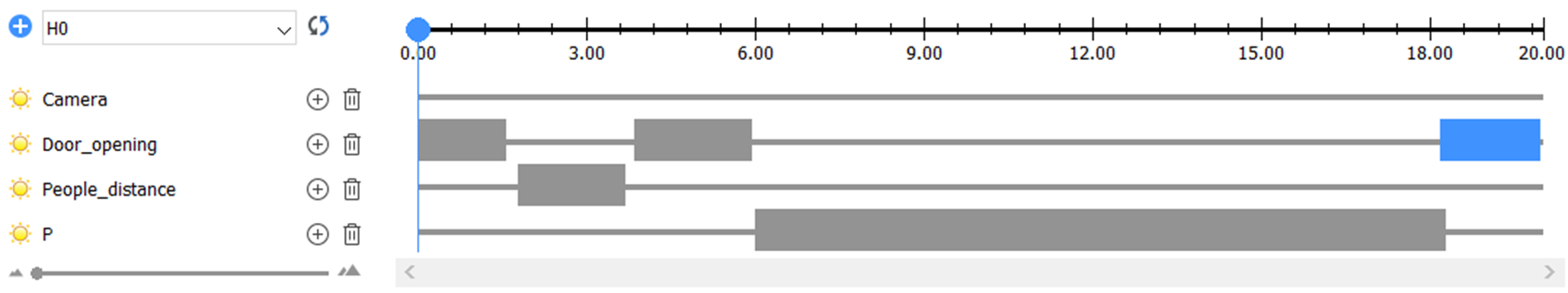 Verwenden Sie den Zeitachsen-Bereich, um Zeitachsen hinzuzufügen und zu entfernen, um Animationssequenzen hinzuzufügen und zu entfernen und um den Animationsplan anzuzeigen. Klicken Sie auf eine Animationssequenz, um sie auszuwählen, oder ziehen Sie den Anfang oder das Ende des Balkens, um die Dauer anzupassen. Die ausgewählte Animationssequenz wird blau angezeigt, andere Sequenzen werden grau dargestellt. Jede Zeitachse im Bereich "Zeitachsen" kann vorübergehend deaktiviert werden, um sie von der Animation auszuschließen.