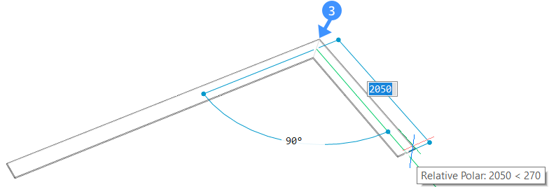 Wählen Sie einen Endpunkt aus oder geben Sie einen Wert in das dynamische Eingabefeld ein und drücken Sie die Eingabetaste. Die Grundfläche (3) der angrenzenden Wand wird angezeigt. Wählen Sie einen neuen Endpunkt oder geben Sie Werte in das dynamische Eingabefeld ein, um angrenzende Wandsegmente zu erstellen.